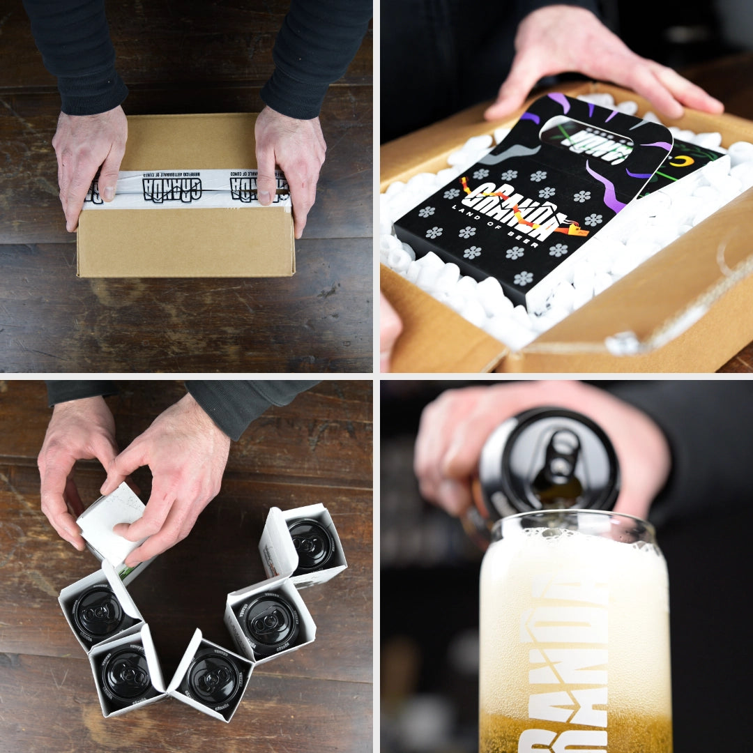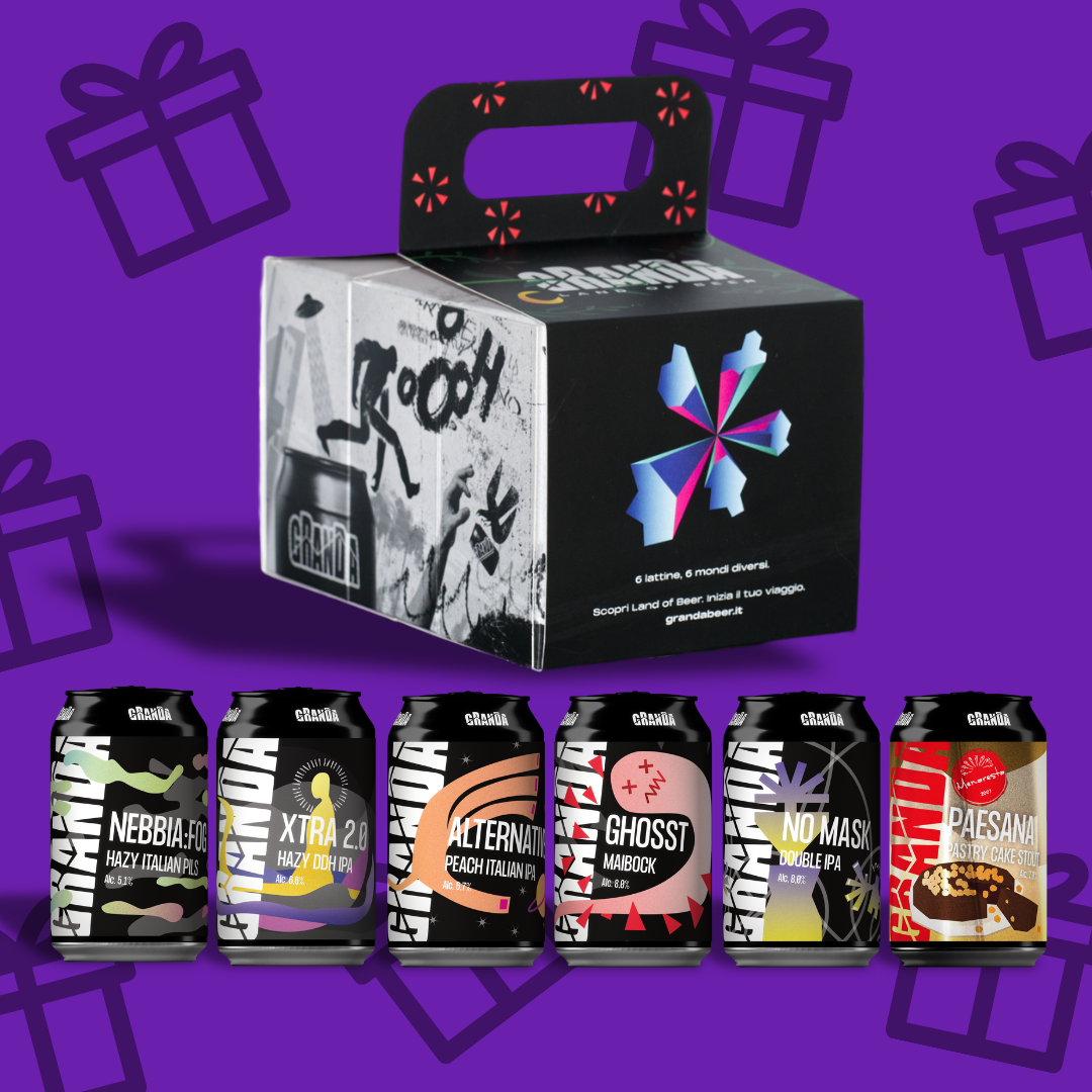 Il pack si apre a fisarmonica per svelare tutte le fake news sulla birra artigianale: noi non ve le diamo a bere! La grafica della fascia con manico che veste il pack la scegli tu: ti senti più Black & White, Explosion o Mosaic?